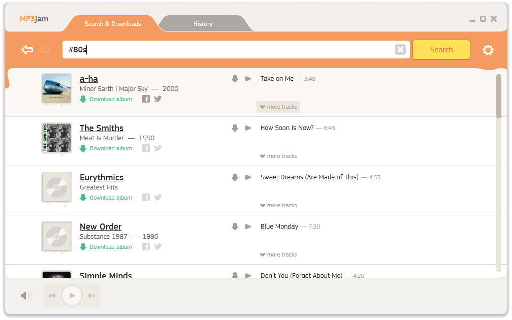 If you missed genres list on the main window, you may easily try typing #rock, #pop, #indie, #alternative, #jazz, #classical, #electronic, #metal, #punk, #hip-hop, #raggae, #house, #folk, #country, #disco, #lounge, #blues, etc. and get top songs by genre.